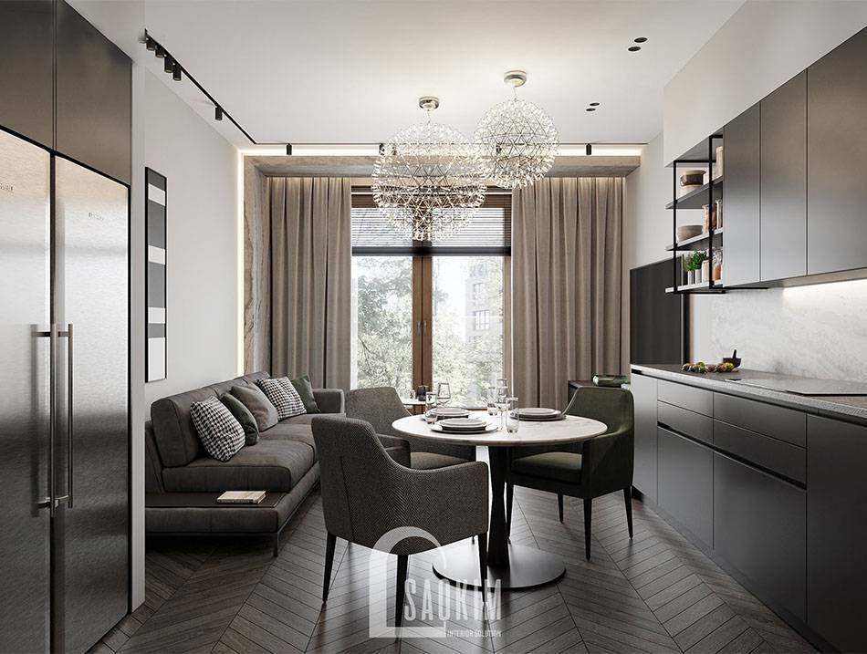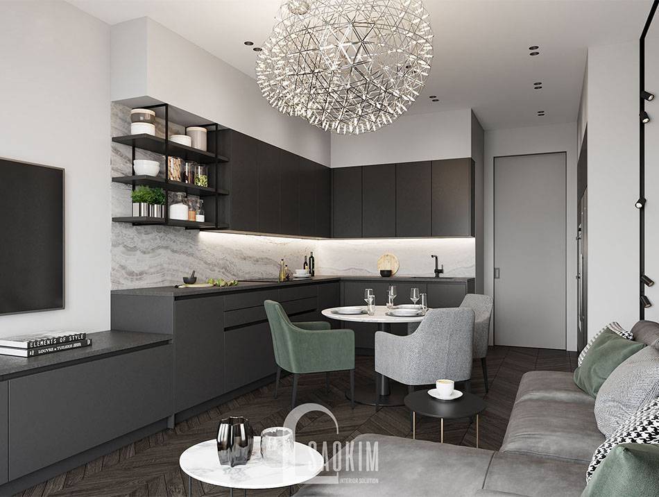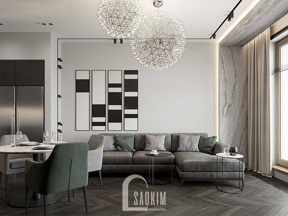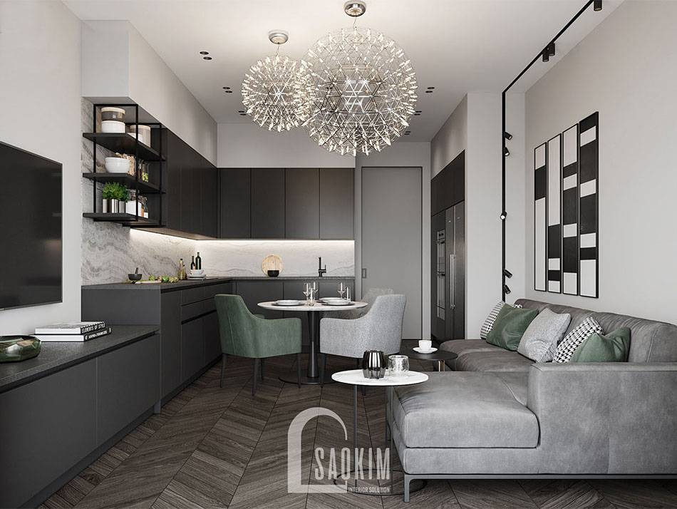 Mẫu phòng khách và bếp chung cư 85m2 Bohemia Residence