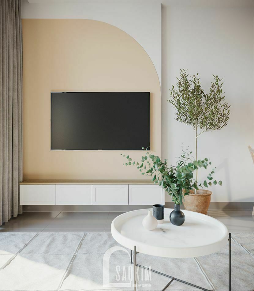 Đối diện sofa là TV treo tường nổi bật trên mảng tường được sơn màu kem. Bên dưới là kệ tủ thấp màu trắng với bề mặt bằng gỗ tạo nên 1 bố cục đơn giản, bắt mắt. Ánh sáng len lỏi qua các kẽ lá mang đến không gian trẻ trung, tươi mới và tràn đầy sức sống.