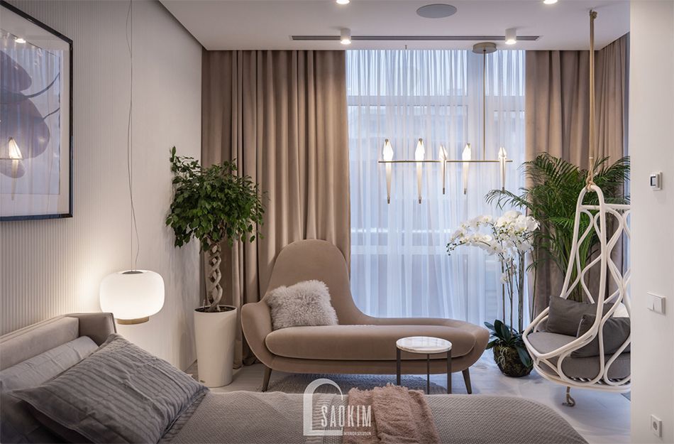 Bộ bàn trà và sofa với thiết kế sang trọng, cuốn hút mang lại vẻ đẹp hài hòa, thư giãn cho không gian. Một chiếc xích đu đơn giản, tinh tế trong phòng ngủ rất hút mắt, khiến đối phương yêu ngay từ cái nhìn đầu tiên. Đèn thả trần phá cách tựa như những chú chim mang tính thẩm mỹ cao tạo điểm nhấn nổi bật cho không gian.