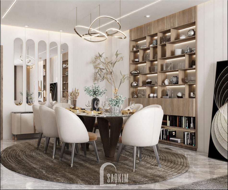 Phòng ăn bố trí tủ rượu cao cấp bằng gỗ sồi được thiết kế âm tường mang nét thẩm mỹ cao và tối ưu không gian. Với hệ tủ nhiều ngăn tiện lợi giúp gia chủ có thể trưng bày thêm những món đồ kỉ niệm hay những cuốn sách yêu thích. Bộ bàn ghế ăn đặt giữa trung tâm phòng nổi bật trên tấm thảm trải sàn. Bàn ăn được thiết kế hiện đại với chân bàn độc đáo bằng chất liệu gỗ kết hợp mặt bàn kính sang trọng, cao cấp.
