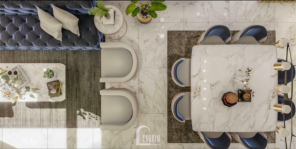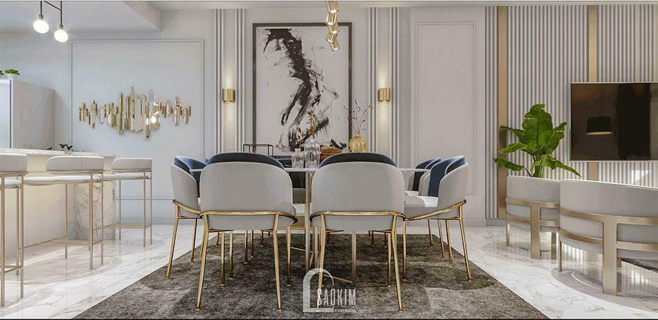 Thiết kế phòng ăn với những đường nét hiện đại, tinh tế. Bộ bàn ghế ăn lớn dành cho 6 người được đặt giữa phòng. Bàn ăn sang trọng với mặt bàn đá vân mây kết hợp chân kim loại mạ vàng cao cấp. Ghế ăn màu trắng- xanh nhã nhặn, tinh tế được thiết kế kỹ lưỡng mang lại cảm giác thoải mái khi ngồi.