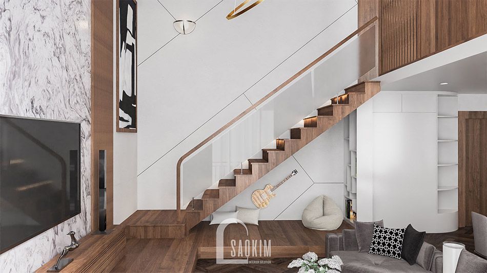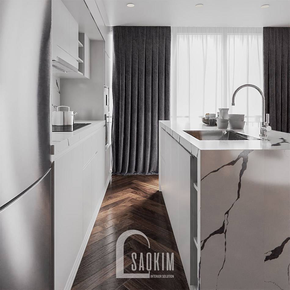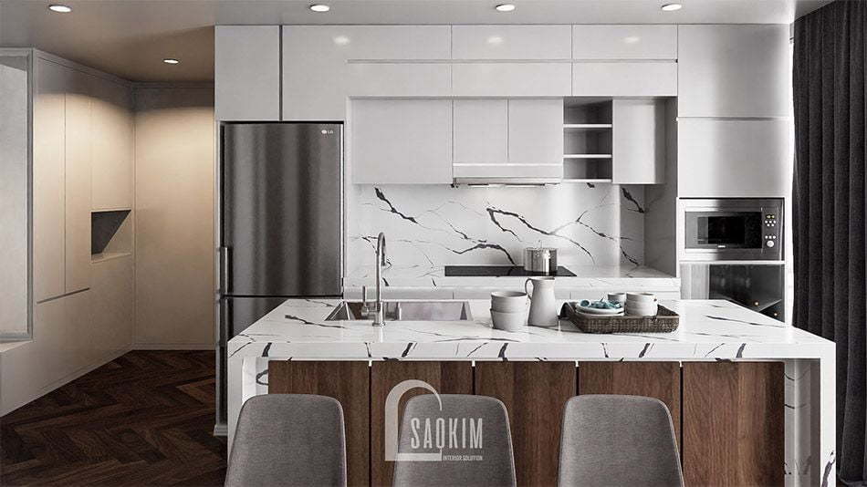 Mẫu thiết kế nội thất phòng bếp chung cư Duplex Pentstudio mang vẻ đẹp phóng khoáng, cởi mở và sạch sẽ. Phòng bếp được đặt ngay cạnh phòng khách với thiết kế mở thông thoáng. Ngoài ra,nội thất phòng bếp được tối ưu với mezzanine tạo ra trải nghiệm sống hoàn toàn khác biệt.