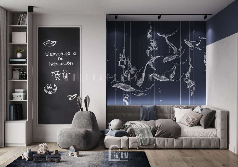 Thiết kế phòng ngủ bé trai yêu thích biển cả và những chú cá voi xanh đẹp, đơn giản