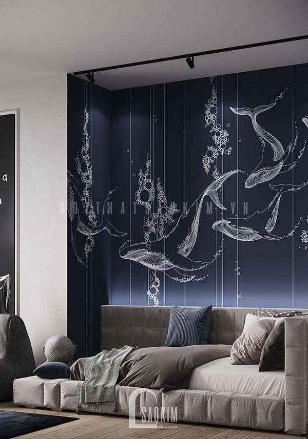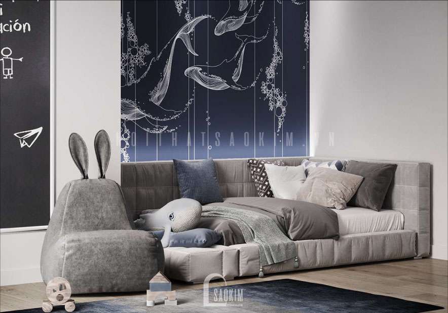 Thiết kế không gian phòng ngủ cho bé khá rộng rãi đảm bảo sự phát triển tốt nhất cho bé. Tường sát giường ngủ sử dụng mảng màu xanh dương và vẽ những chú cá voi vô cùng đáng yêu.