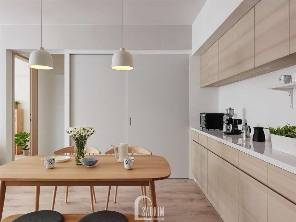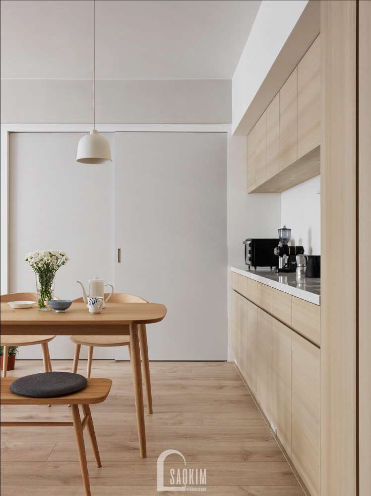 Bàn ăn được đặt gần cửa sổ trong không gian sáng, tạo điểm nhấn và cho phép ánh nắng tự nhiên chiếu vào, làm tăng thêm sự tươi mới và sinh động. Đèn trang trí được lựa chọn cẩn thận, không chỉ để cung cấp đủ ánh sáng khi làm việc mà còn để tạo điểm nhấn thẩm mỹ cho không gian.