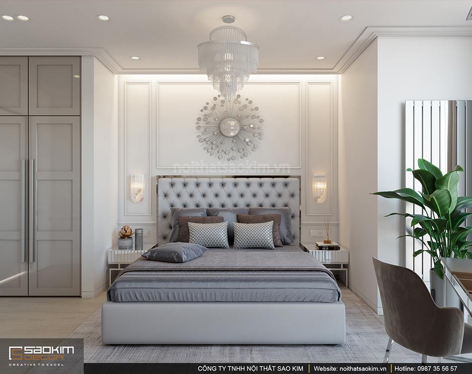 Phòng ngủ theo phong cách tân cổ điển với giường ngủ được đặt ở trung tâm căn phòng. Đầu giường được trang trí đẹp mắt với phào chỉ và món đồ trang trí. Tab đầu giường chất liệu kim loại mang vẻ đẹp bóng bẩy cho nơi đây. Đèn ngủ treo tường đẹp mắt.