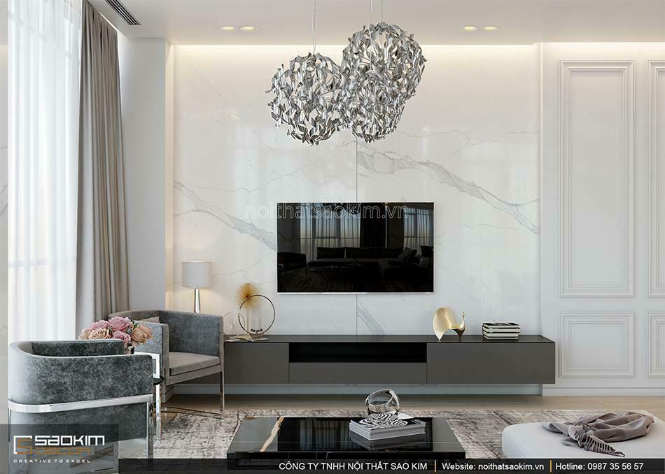 Thiết kế chung cư với phần tường sát kệ tivi được ứng dụng phong cách thiết kế tân cổ điển cùng với chi tiết trang trí đẹp mắt.