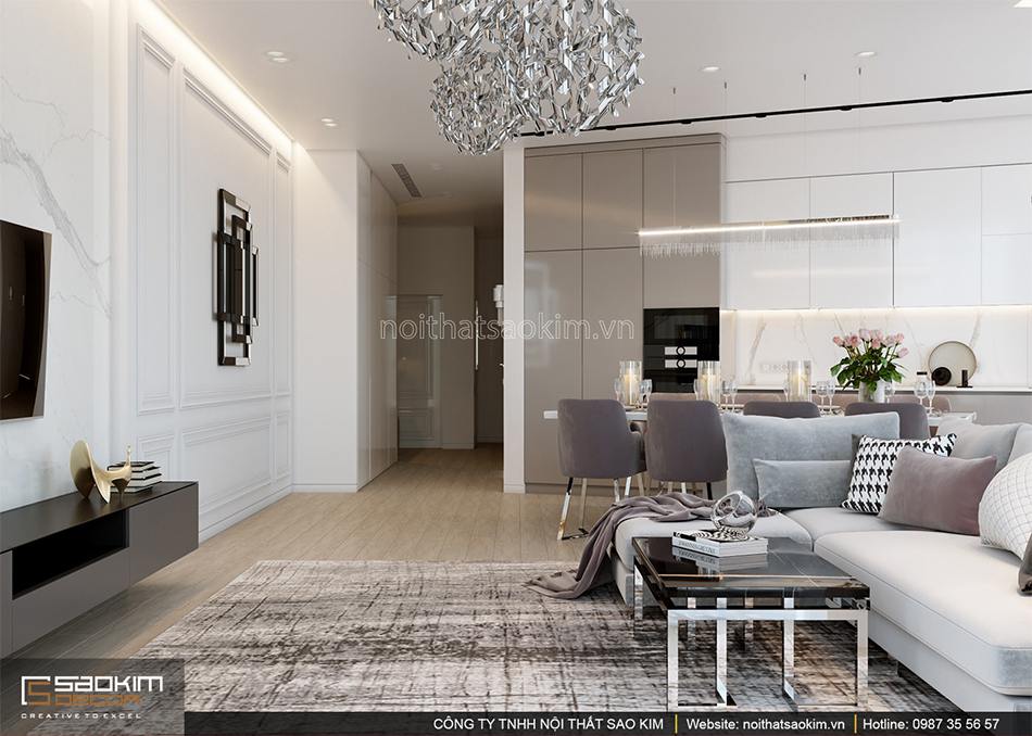 Thiết kế căn hộ chung cư với phòng khách liên kề bếp đã không còn quá xa lạ với mỗi người. Xu hường này cũng được ưa thich và ứng dụng cho căn hộ này. Nó không chỉ giúp căn hộ trở nên tông thoáng hơn, liên kết các không gian sinh hoạt chung.