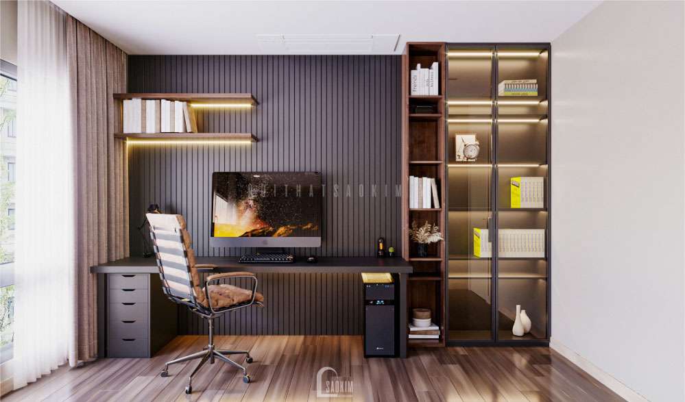 Thiết kế phòng làm việc tại nhà tạo cmr hứng làm việc, bàn làm việc rộng rãi, thoải mái kết hợp với kệ sách được thiết kế hiện đại tạo không gian riêng mang tính thời thượng.