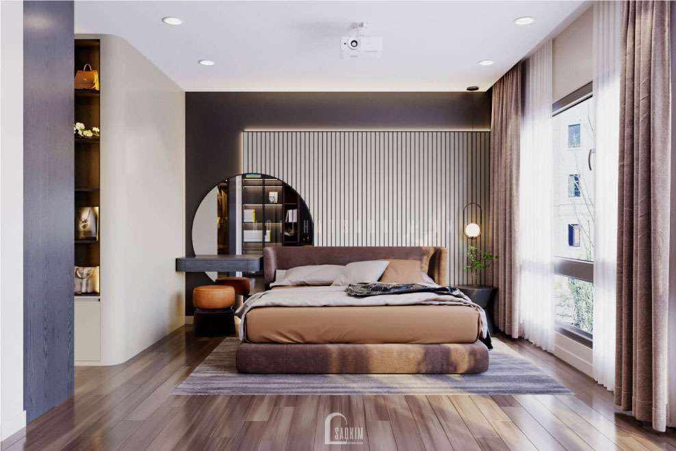 Chiếc giường êm ái được đặt giữa căn phòng tạo giấc ngủ êm ái mỗi khi gia chủ làm việc mệt mỏi. Bàn trang điểm như được thiết kế riêng cho căn phòng này, chiếc gương tròn lớn đặt ngay cạnh đầu giường đơn giản, nhưng rất tiện nghi.