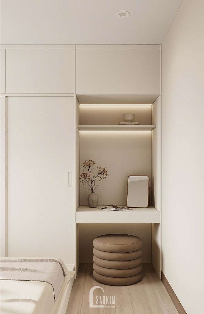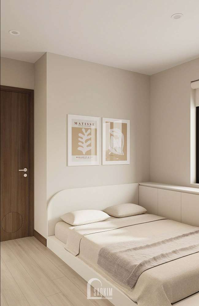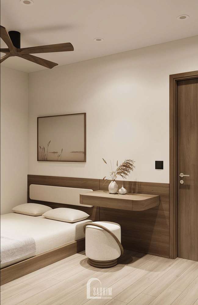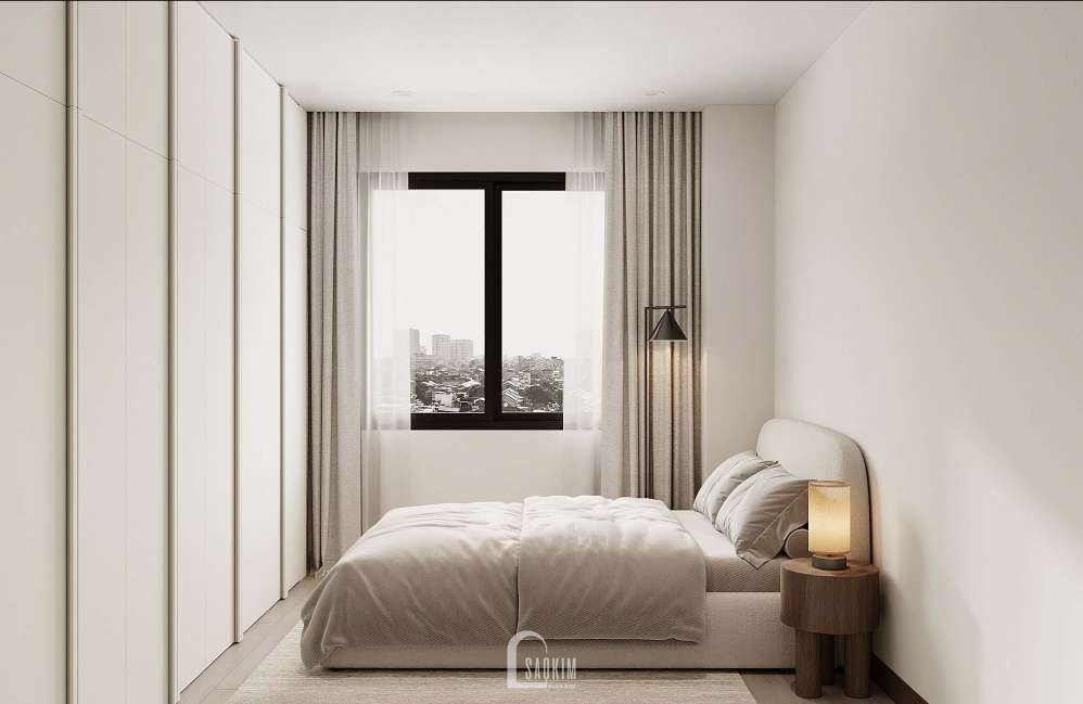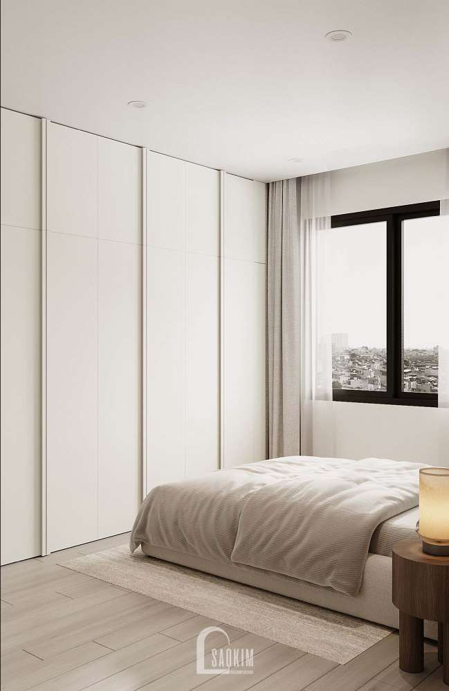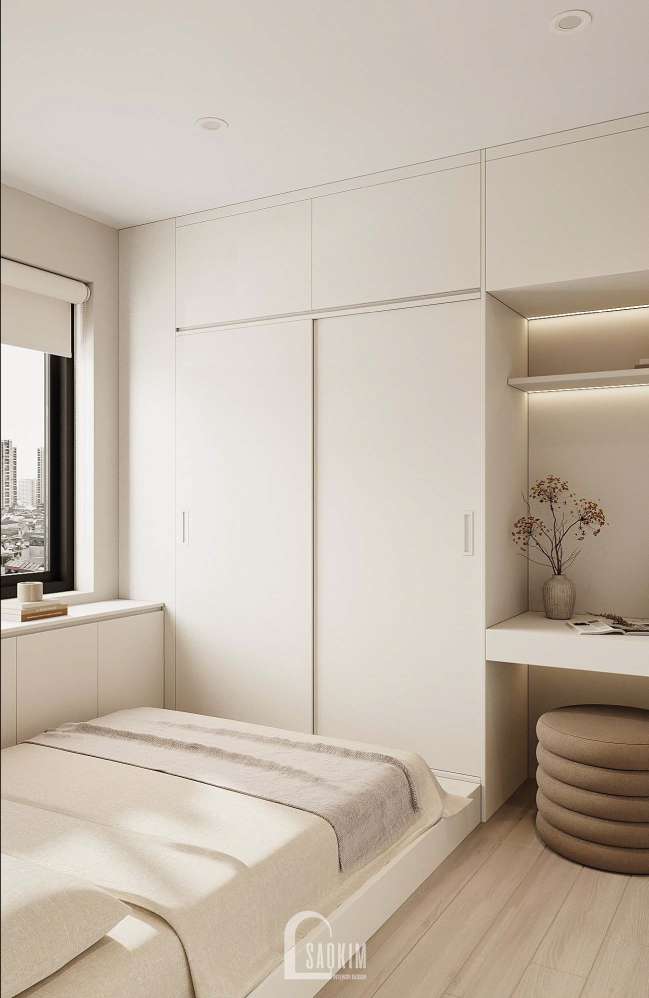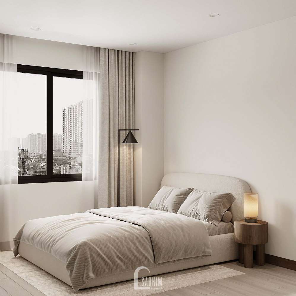 Thiết kế không gian phòng ngủ với gam màu chính là trắng kem kết hợp đồ nội thất nhẹ nhàng tạo nên không gian ấm áp và gần gũi với thiên nhiên.