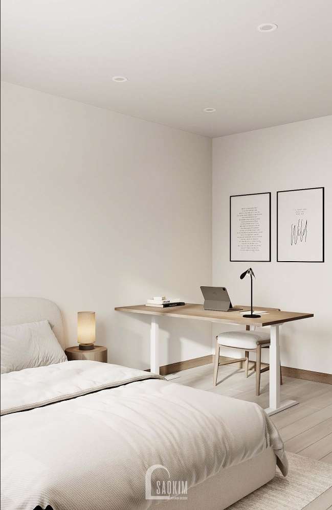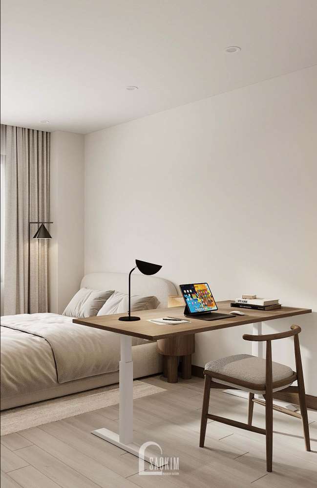 Bàn làm việc được đặt cố định trong phòng ngủ giúp gia chủ tiện nghi trong việc làm và nghỉ.