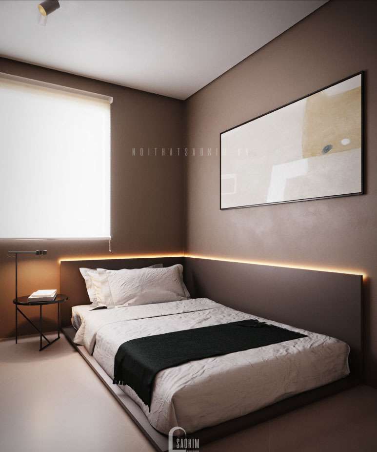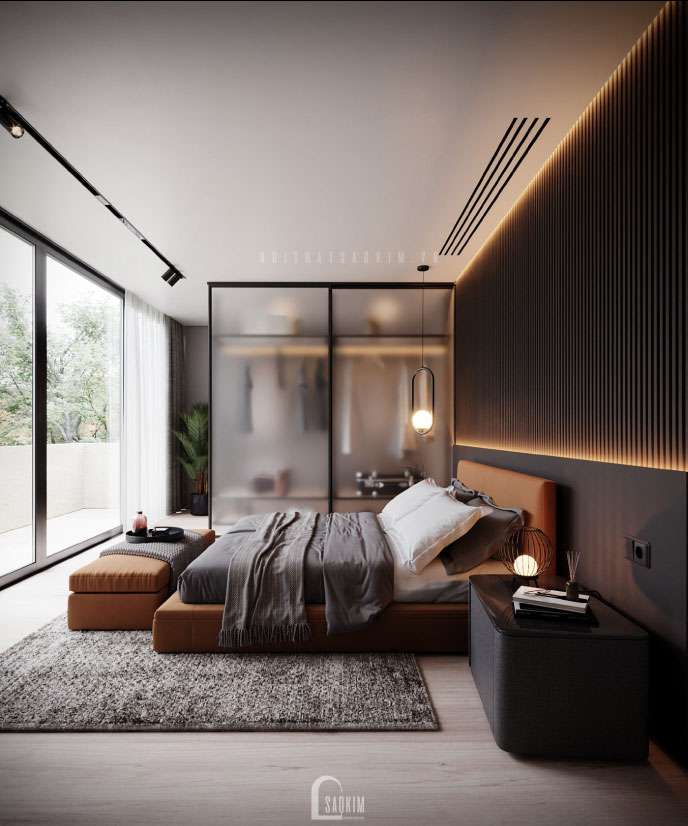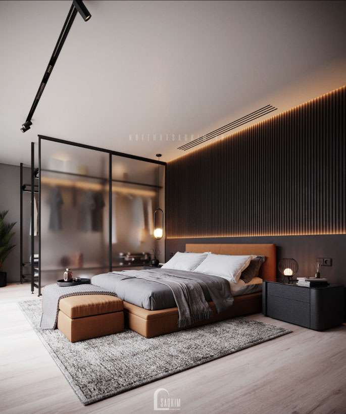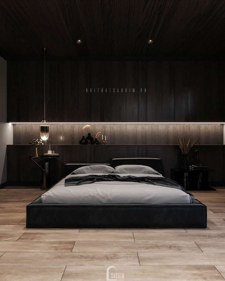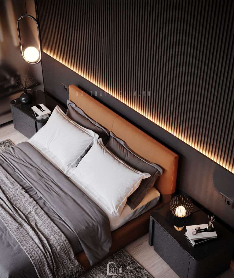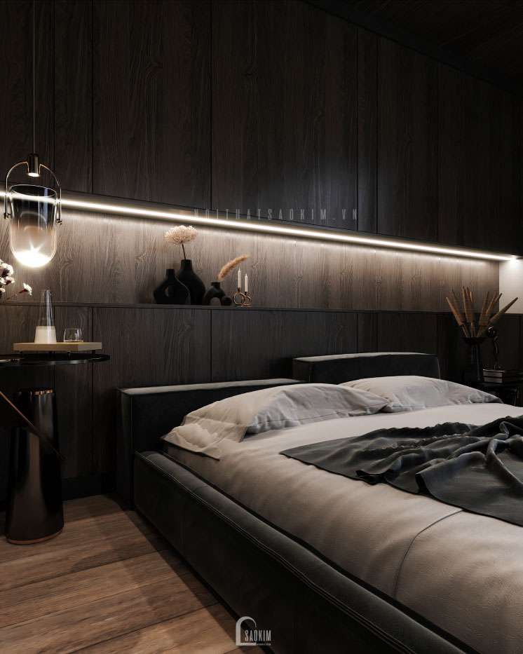 Không gian phòng ngủ với gam màu tối tạo cảm giác ấm cúng, thư giãn trong thiết kế căn hộ Penhouse hiện đại