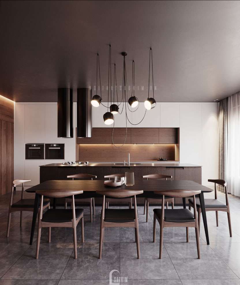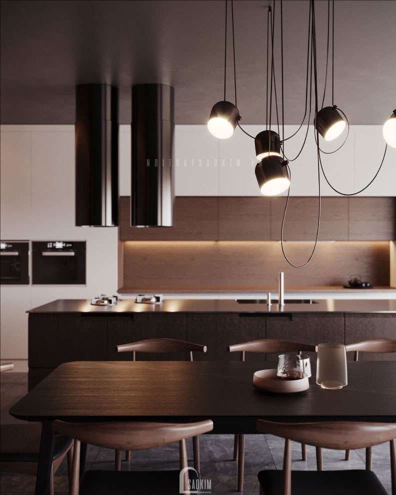 Sử dụng tông màu tối đang được ưa chuộng hơn bởi chúng đem đến nét đẹp sang trọng, cũng như dễ dàng giữ vệ sinh cho căn bếp cho gia chủ. Bộ bàn ăn sử dụng chất liệu gỗ cao cấp trơn mịn, sang trọng, đèn thả trần cung cấp đủ ánh sáng tạo cảm giác ấm cúng, sang trọng cho căn phòng.