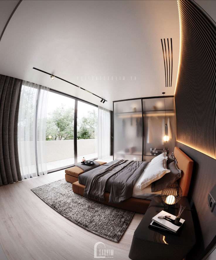 Căn phòng ngủ có cửa kính ban công rộng lớn để có thể đón trọn vẹn ánh sáng tự nhiên giúp không gian thêm thông thoáng và rộng rãi hơn.