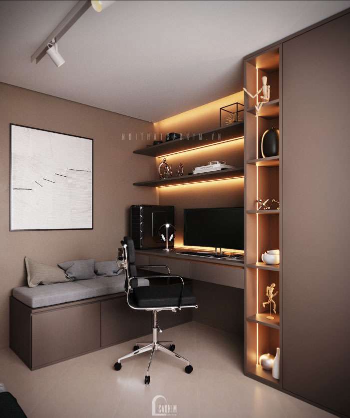 Phòng làm việc tích hợp phòng ngủ với nội thất tiện lợi trong thiết kế căn hộ Penhouse
