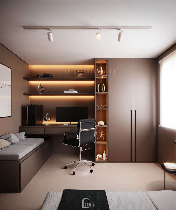 Thiết kế tích hợp phòng làm việc và phòng ngủ với phong cách trang nhã. Phong cách nhẹ nhàng này được rất nhiều người yêu thích.