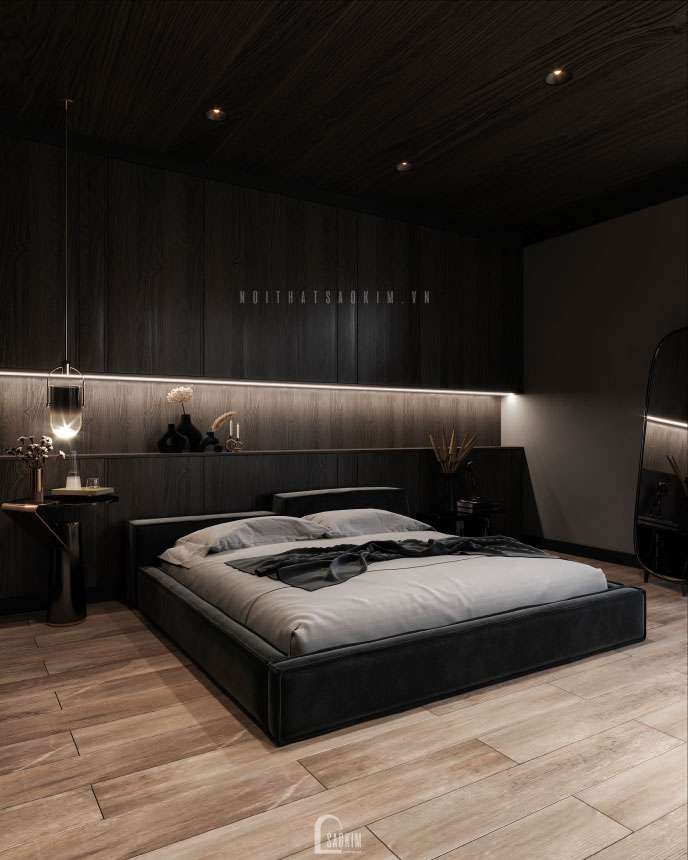 Thiết kế phòng ngủ đẹp, cá tính với gam màu tối ấn tượng người nhìn trong thiết kế căn hộ Penhouse