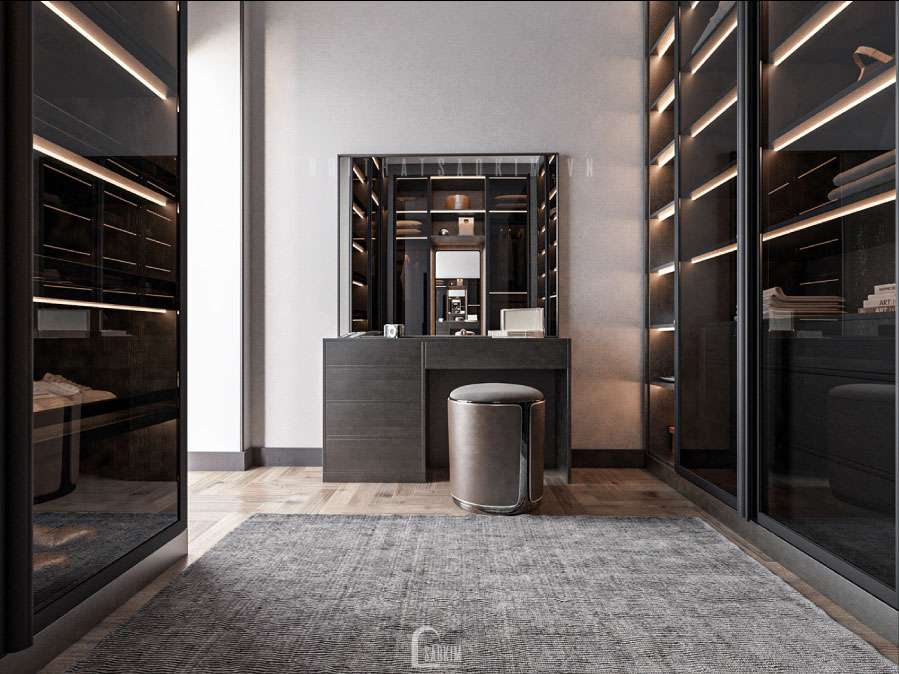 Bàn trang điểm được thiết kế với kích thước vừa khít với kiến trúc phòng một cách tinh tế