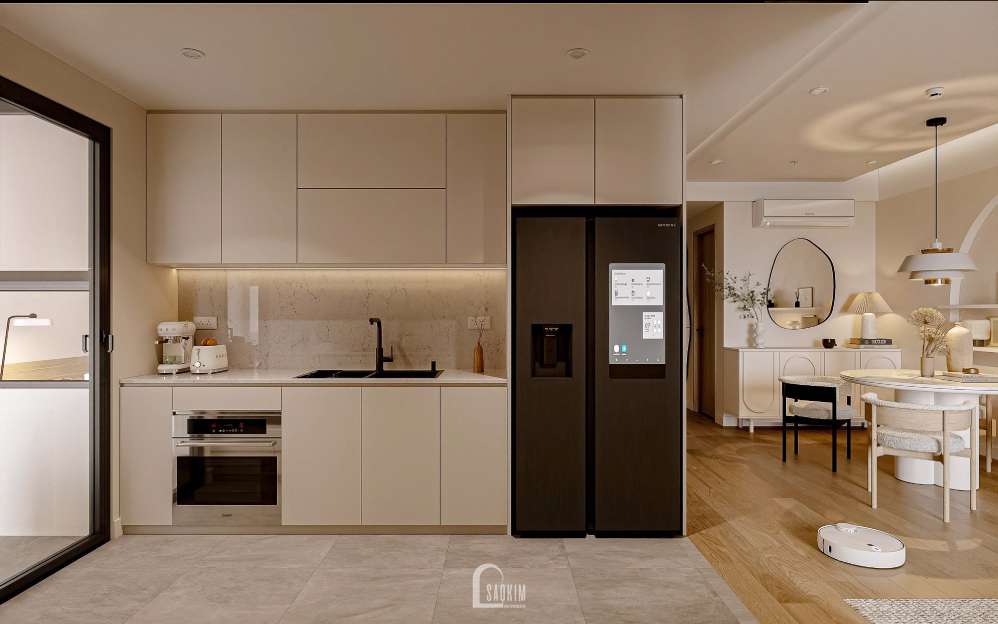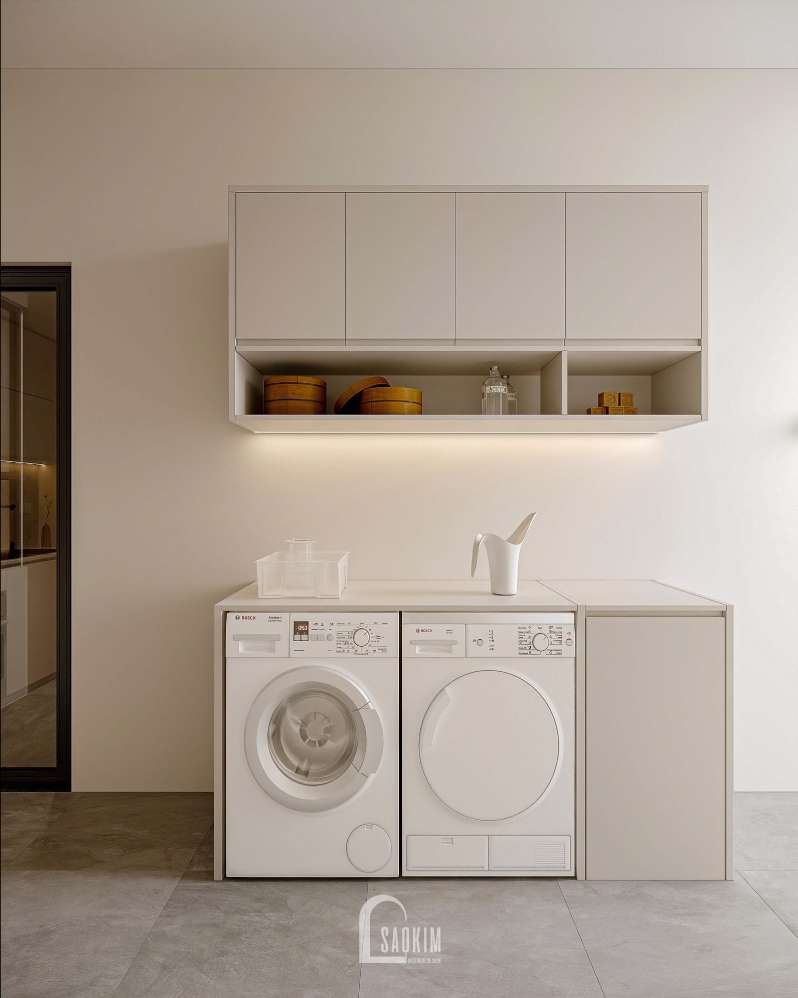 Không gian được thiết kế với các góc vuông và đường nét tối giản để tạo ra một cảm giác gọn gàng và tỉ mỉ.