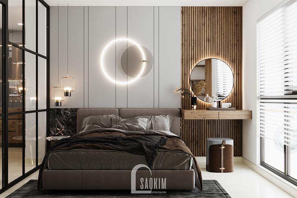 Các gam màu xám, nâu, trắng kết hợp hài hòa tạo cho phòng ngủ cám giác ấm cúng nhưng vẫn không kém phần sang trọng. Mỗi chi tiết đồ nội thất đều được chăm chút tỉ mỉ.