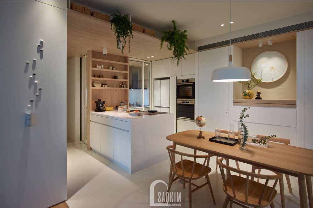 Bàn ăn gồm 4 người cho gia đình được KTS Sao Kim lựa chọn từ chất liệu đến hình dáng phù hợp tạo nên không gian nghệ thuật sống động, vừa đẹp mắt đơn giản, tiện nghi mà sang trọng.