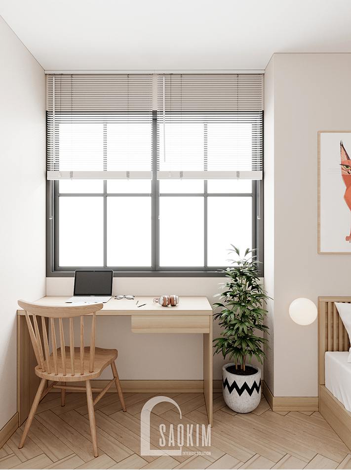 Bàn học của bé bố trí cạnh cửa sổ để tận dụng ánh sáng tự nhiên bảo vệ mắt cho bé trong quá trình học tập, đọc sách.