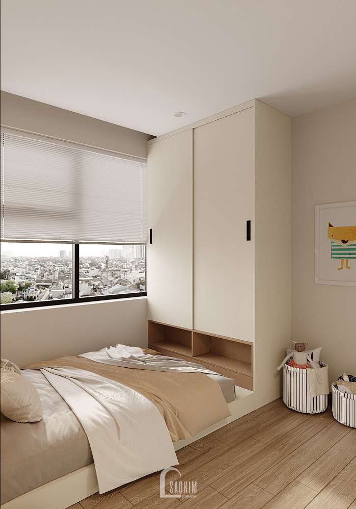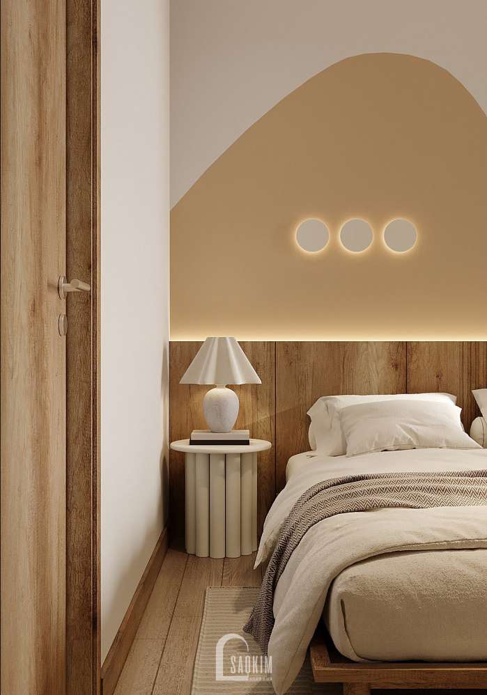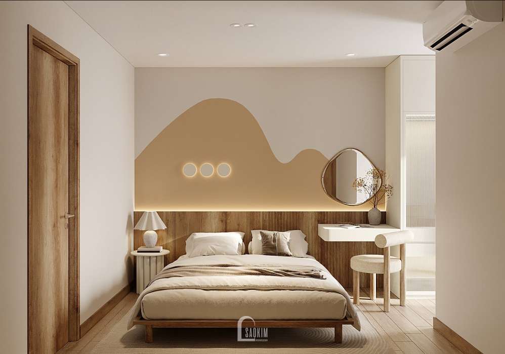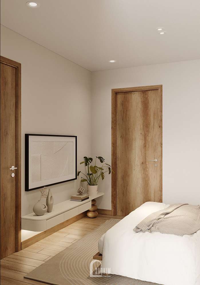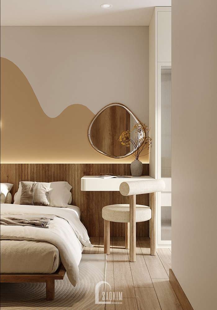 KTS Nội thất Sao Kim thiết kế phòng ngủ phong cách Wabi Sabi kết hợp từ màu sắc đến nội thất mang đến một không gian tĩnh lặng, yên bình và tràn ngập sự ấm áp.