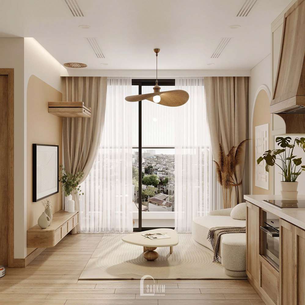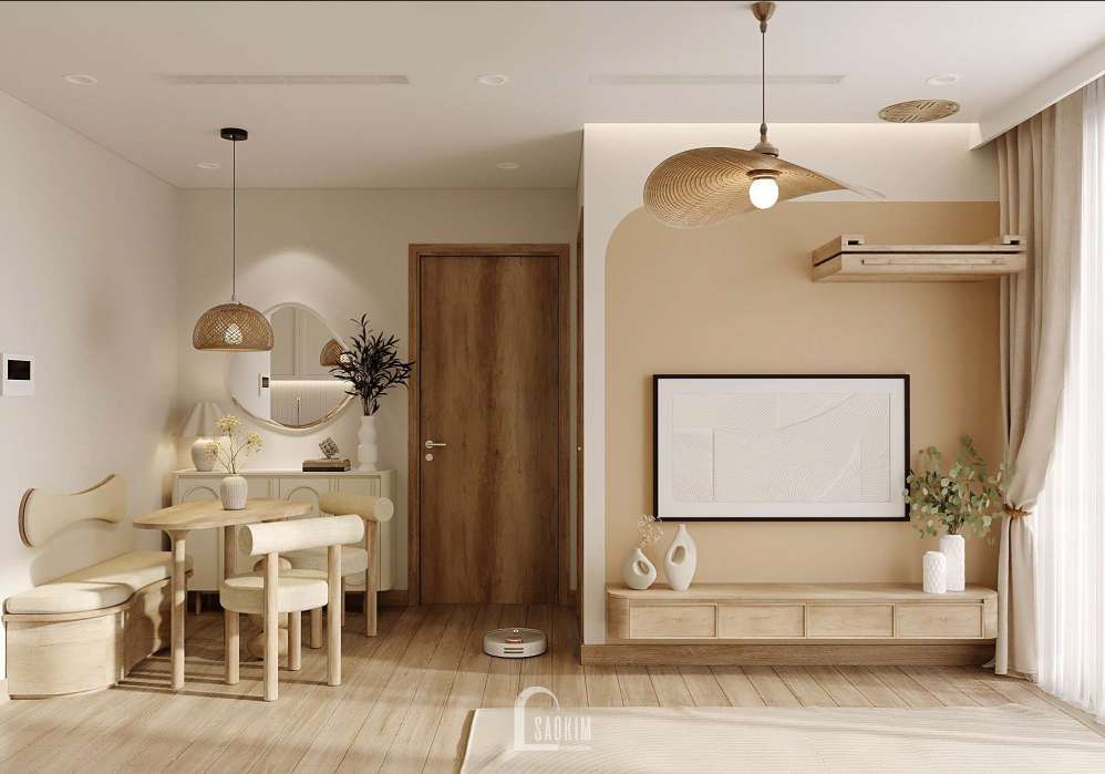 Thiết kế chung cư phong cách Wabi Sabi giúp không gian trở nên tươi sáng, sử dụng tranh, các đồ nội thất trang trí làm cho căn phòng thêm sống động.