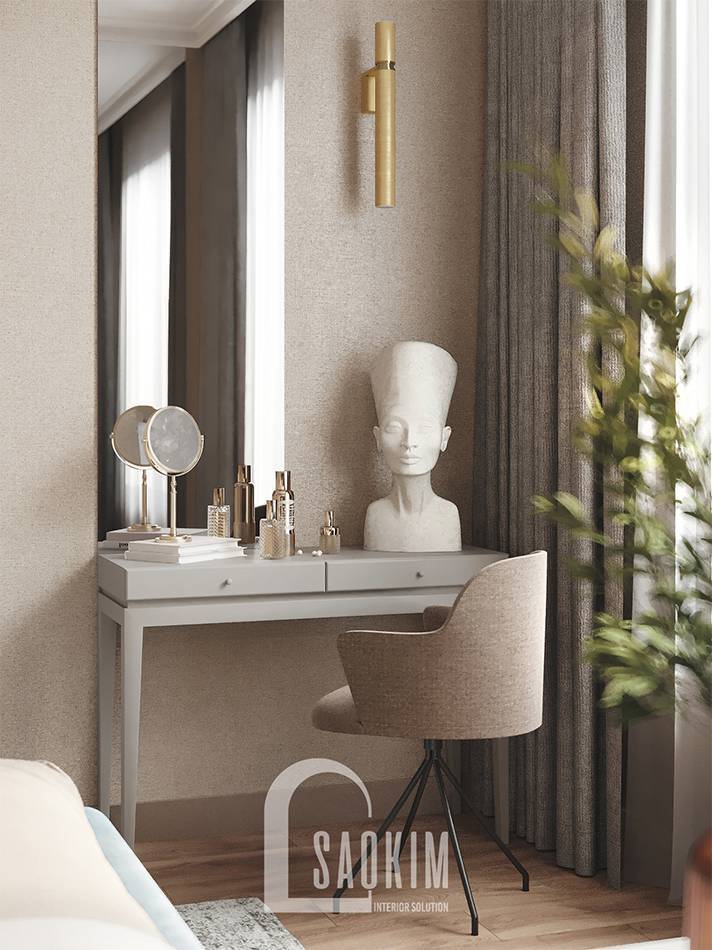 Có thể nói giấc ngủ là điều rất quan trọng trong cuộc sống. Ắt hẳn bạn cũng hiểu được tầm quan trọng của phòng ngủ. Vì vậy gia chủ rất chăm chút đến không gian nghỉ ngơi trong căn hộ 1,5phòng ngủ 6TH Element của mình. Gam màu be được lựa chọn làm màu chủ đạo cho phòng ngủ. Đồ nội thất đơn giản được bố trí cùng với màu sắc mang đến phòng ngủ ám áp, thoải mái và vô cùng lãng mạn cho chủ nhân.