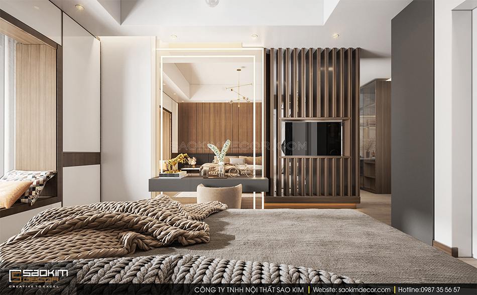 Một bàn trang điểm lớn và ghế bành màu nâu be được đặt cuối đuôi giường. Thiết kế gương cỡ lớn nhằm đón nhận nhiều ánh sáng chiếu vào. Ánh sáng tự nhiên sẽ giúp nữ chủ nhân trang điểm dễ dàng hơn và hiệu ứng trang điểm luôn tốt nhất. Bên cạnh đó còn giúp căn phòng trở nên rộng thoàng hơn. Vách ngăn bằng gỗ tạo cảm giác sang trọng đồng thời khéo léo phân chia không gian nghỉ ngơi và không gian thư giãn của phòng ngủ Master.