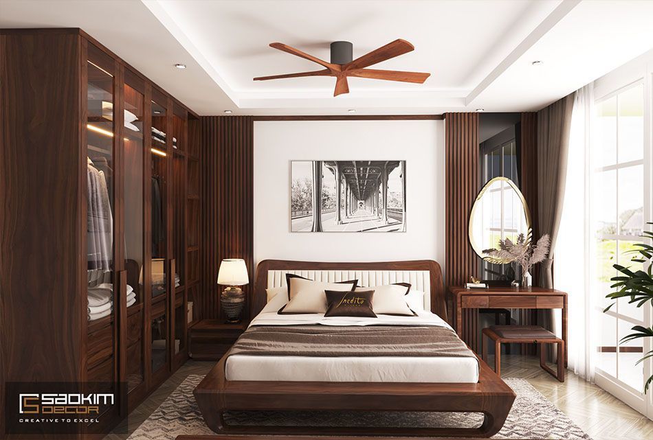 Thiết kế kiến trúc nội thất nhà phố Âu Cơ lựa chọn phong cách hiện đại cho phòng ngủ chính. Từng chi tiết nội thất tại đây được chăm chút kỹ lượng với các đường cong tinh tế trên chất liệu gỗ óc chó. Gam màu trắng cùng màu gỗ mang đến hiệu ứng ấm áp và an toàn cho chủ nhân.