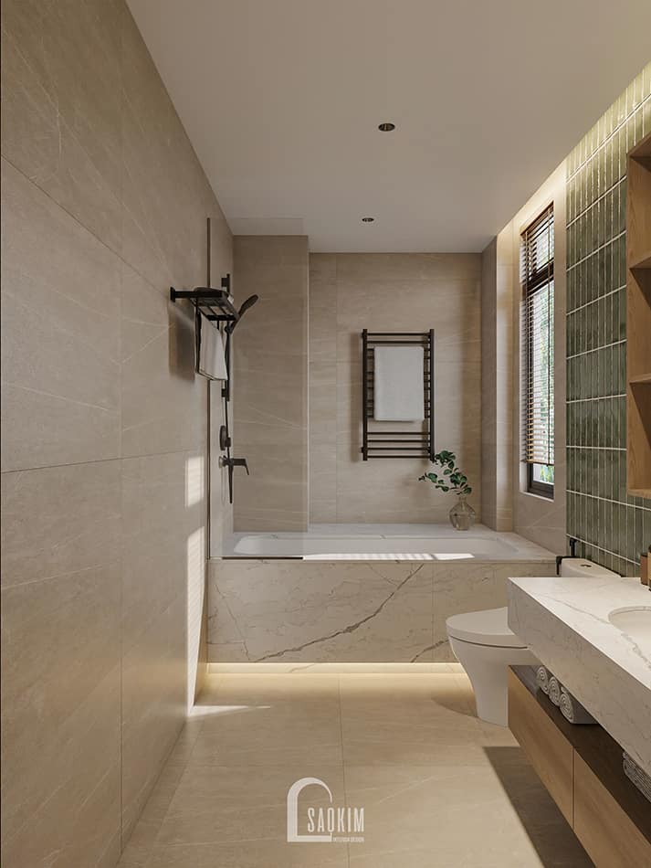 Khu vực WC được phân chia công năng rõ ràng giữa lavabo, khu vệ sinh và khu bồn tắm, đảm bảo sự tiện nghi và riêng tư trong quá trình sử dụng. Vật liệu chủ đạo là đá vân mây, gạch men cao cấp và gỗ chống ẩm, mang đến cảm giác sạch sẽ, hiện đại nhưng vẫn ấm áp.