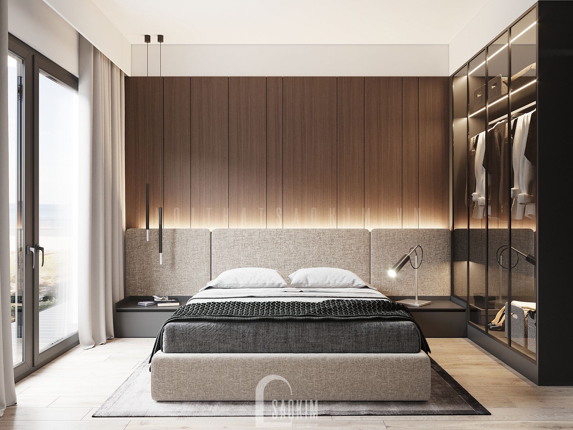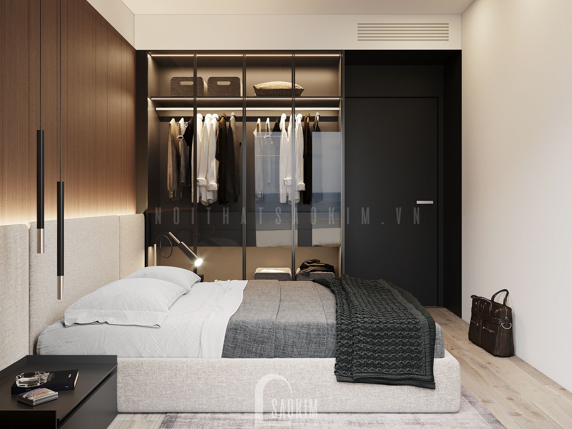 Bên cạnh giường là tủ quần áo được sử dụng kính trong suốt khiến việc lấy đồ trở nên dễ dàng hơn ngoài ra nó cũng tạo nên vẻ hiện đại cho phòng ngủ
