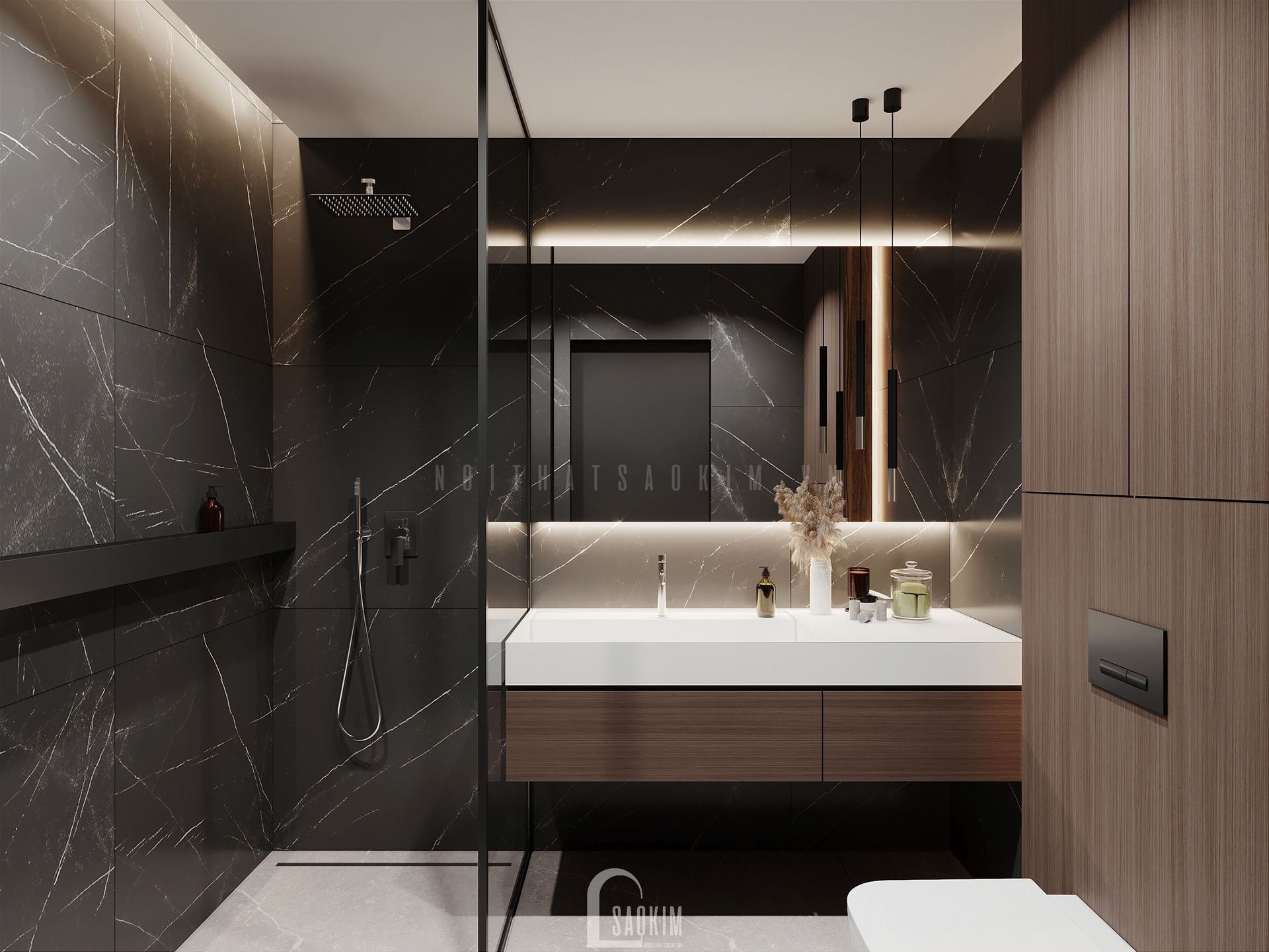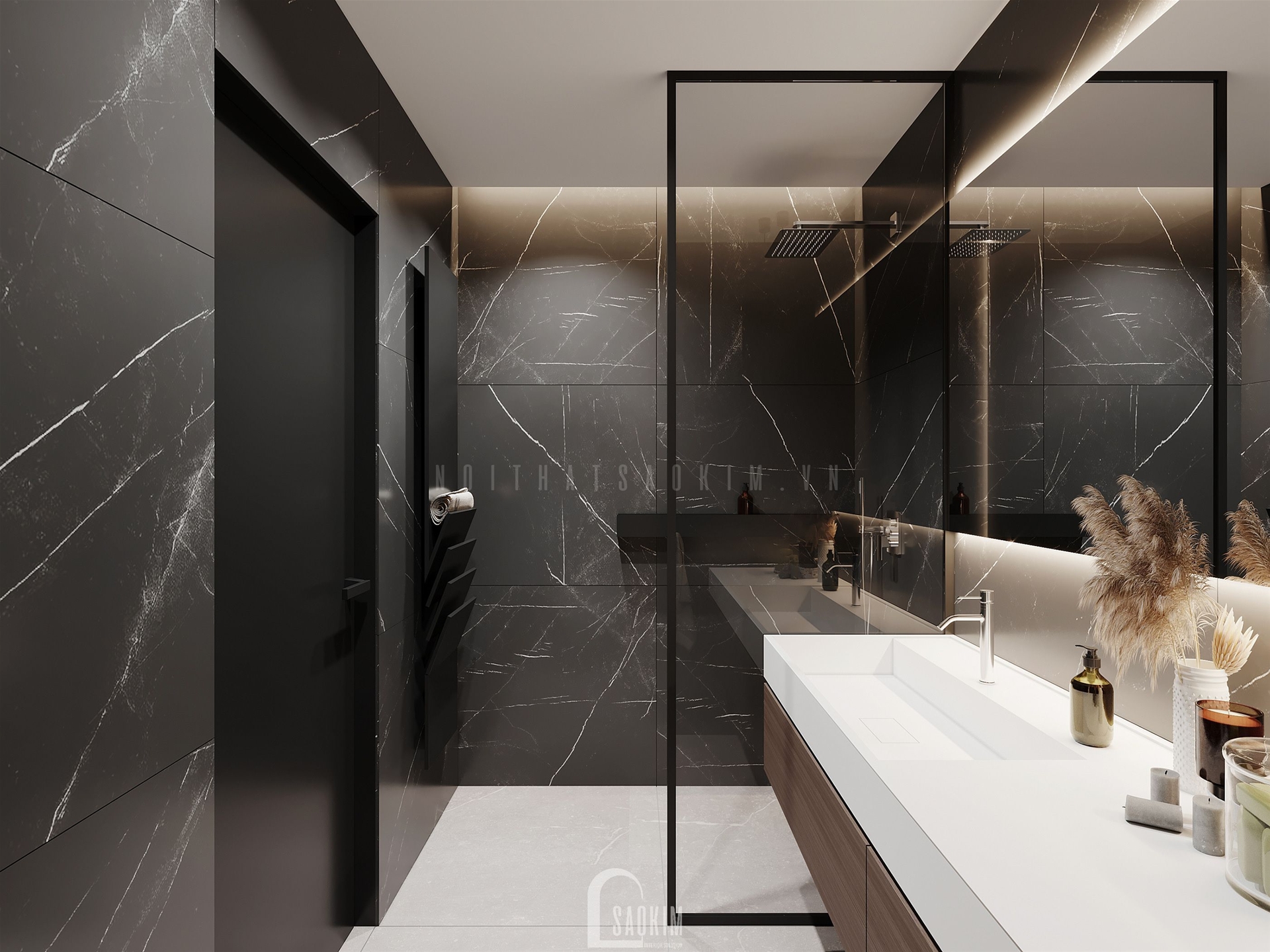 Nhà tắm được thiết kế sử dụng màu tối làm chủ đạo kết hợp với đồ dùng trong nhà tắm được làm tối giản tạo nên một không gian hài hòa.