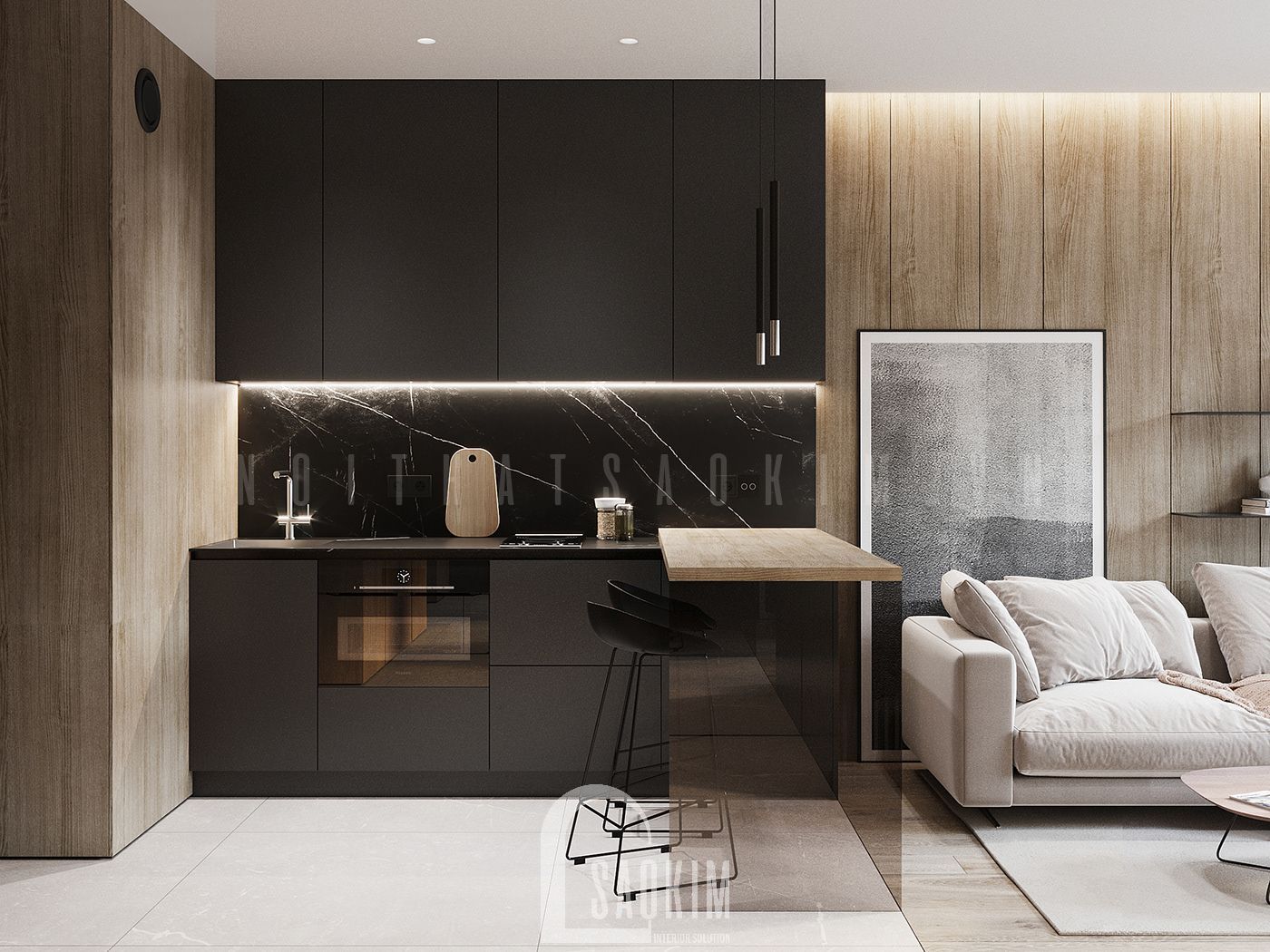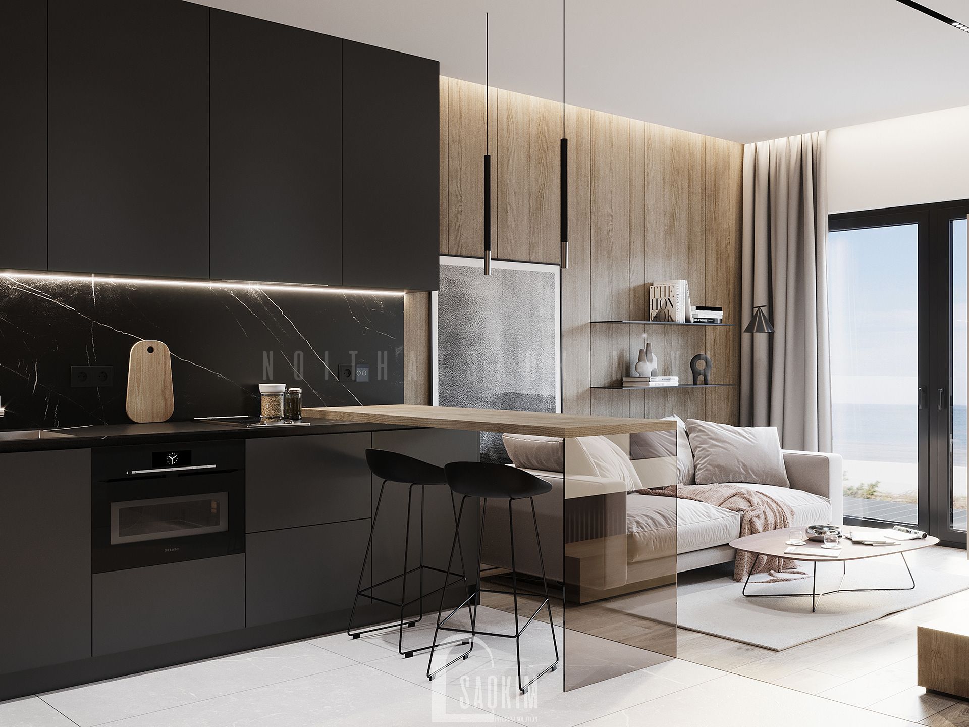 Bếp được đặt ở vị trí của ra vào và phòng khách, toàn bộ đồ nội thất trong phòng bếp được làm với màu đen tương phản với phòng khách và làm nổi bật không gian phòng khách hơn. Khu vực bếp tuy nhỏ nhưng công năng khá đầy đủ với hệ thống tủ bếp trên dưới, đặc biệt khu vực bàn ăn kết hợp quầy bar đặt cạnh với thiết kế độc đáo với chân bàn làm bằng kính và mặt bàn được đặt cao tạo nên 1 khoảng thoáng và không bị vướng tầm mắt khi nhìn từ phòng khách ra.