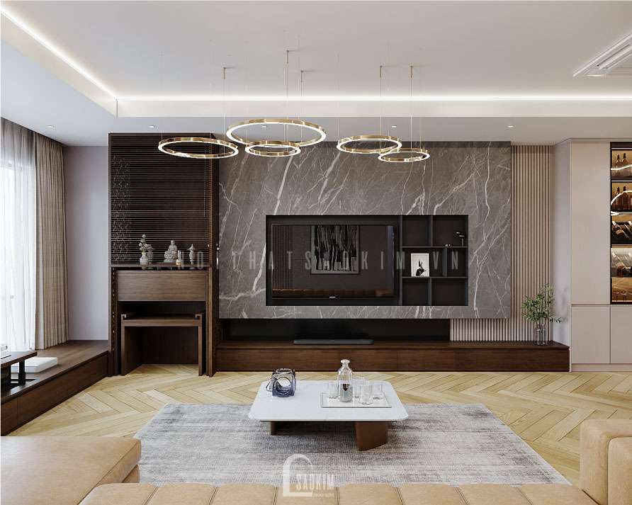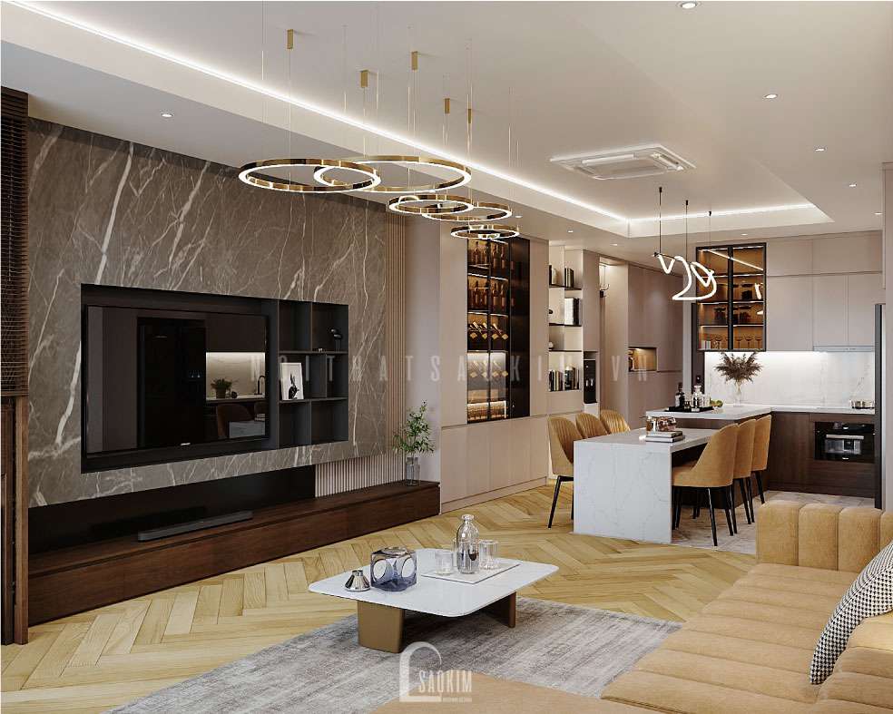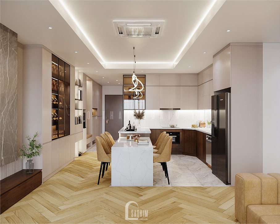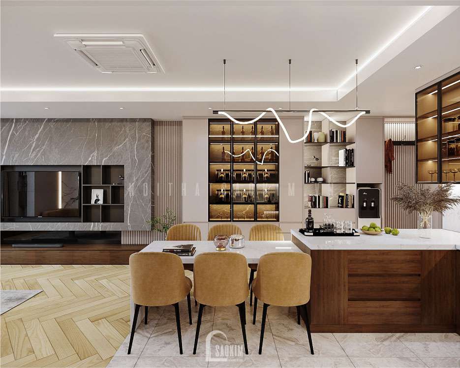 Thiết kế nội thất căn hộ 148m2 theo phong cách hiện đại phù hợp với xã hội, đặc biệt là giới trẻ hiện nay. Thiết kế và thi công trọn gói nội thất Sao Kim mang lại giải pháp tối ưu, bảo toàn công năng, tiện nghi mang lại cho khách hàng những sản phẩm, trải nghiệm tuyệt vời.