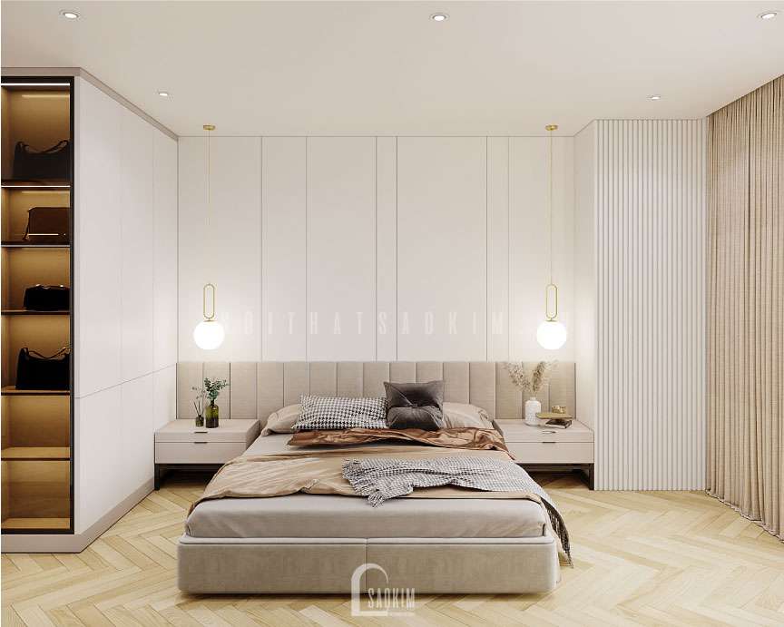 Hai bên giường sẽ có bàn nhỏ để gia chủ có thể đặt những vật dụng cần thiết, bày trí đèn ngủ liền với viền tường phía trên, đồng thời có kệ tủ cất giữ các món đồ cần thiết.
