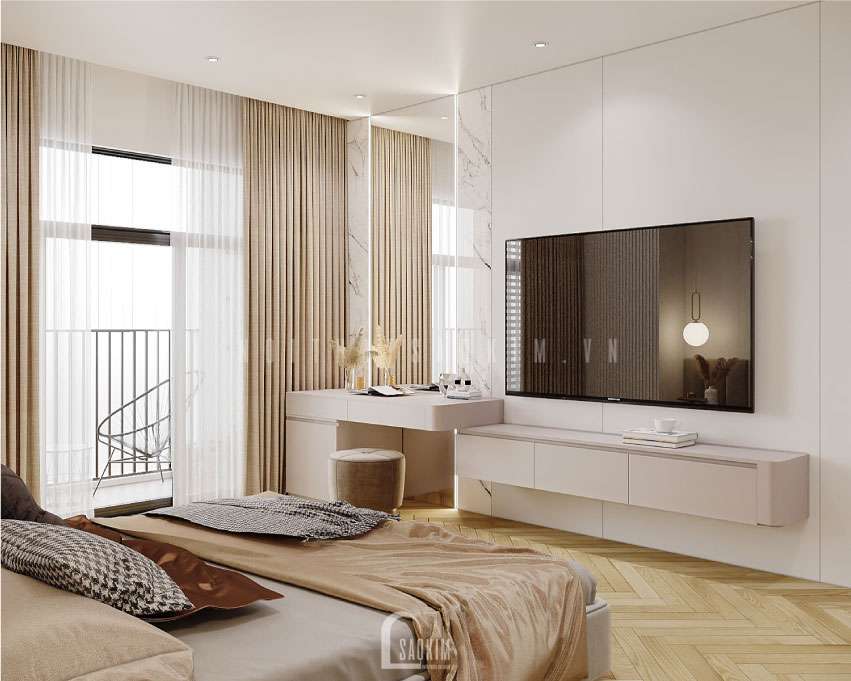 Kệ tivi, tivi treo tường tiết kiệm diện tích cho phòng ngủ nhất là đối với những căn phòng có diện tích không lớn. Việc lắp đặt thêm tivi trong phòng ngủ nhằm mục đích giải trí cho gia chủ.