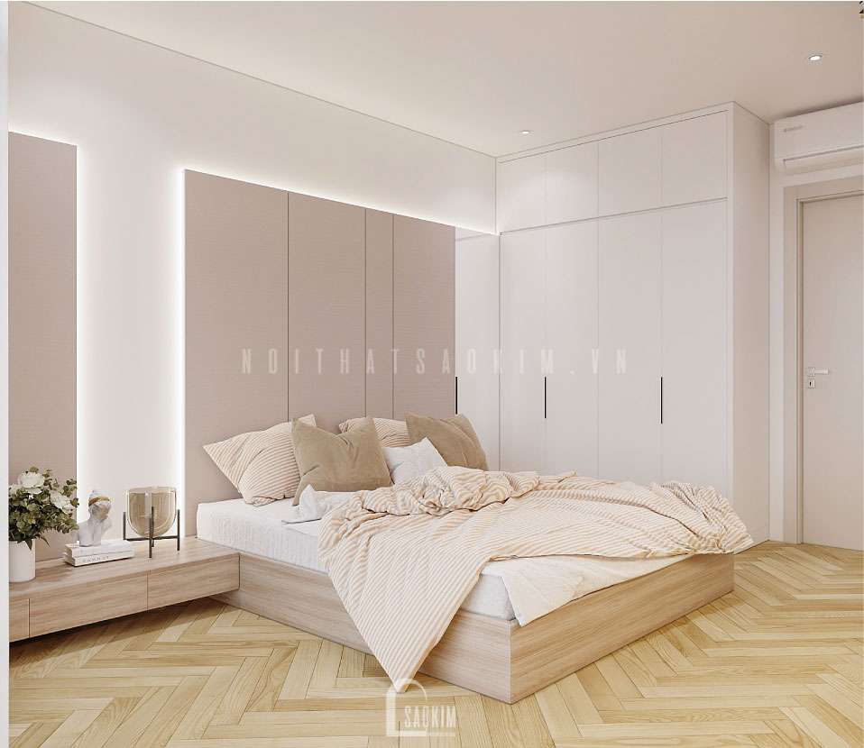 Sàn vân gỗ, giường và kệ đầu giường đều làm từ chất liệu gỗ tự nhiên mang phong cách hiện đại