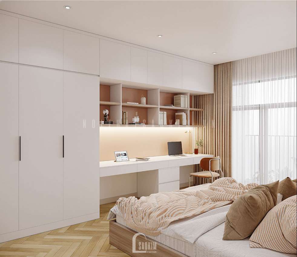 Thiết kế bàn làm việc cạnh kề với tủ quần áo hợp lí, cách bố trí không gian tinh tế, đầy nghệ thuật và vẻ đẹp của những món đồ nội thất cao cấp đã tạo nên một không gian phòng ngủ tiện nghi, ấm cúng và vô cùng sang trọng.