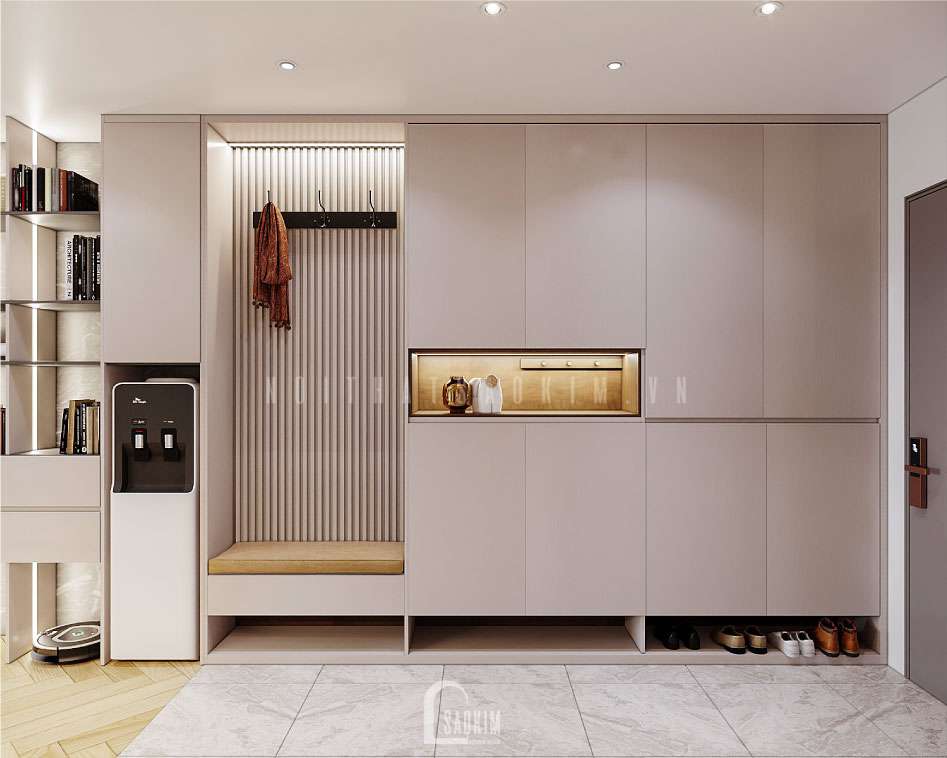 Thiết kế tủ giày đa năng ngay cửa vào tiện nghi, hiện đại.