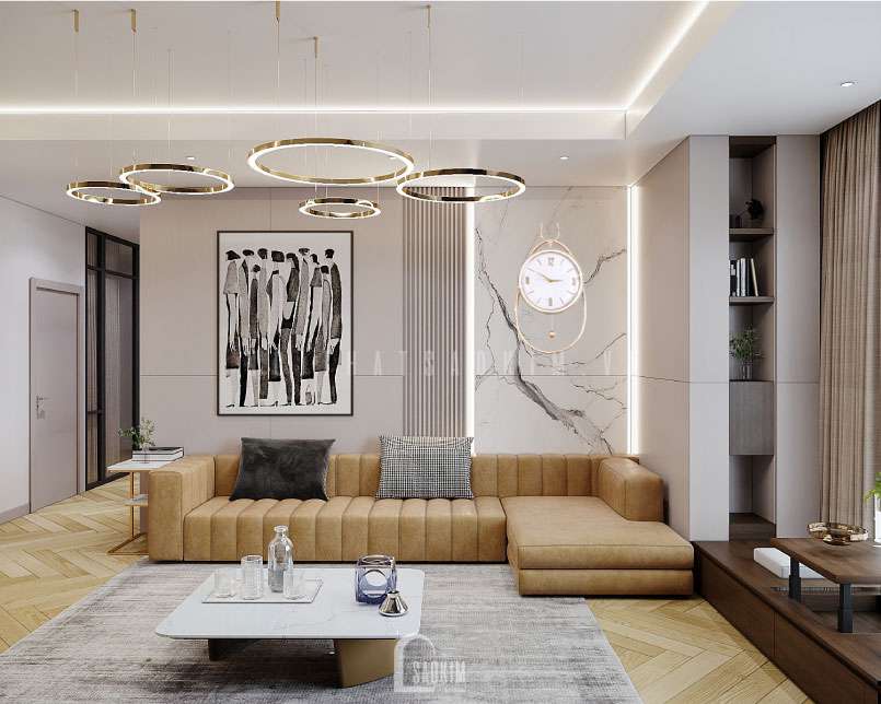 Thiết kế nội thất căn hộ 148m2 phòng khách hiện đại, sang trọng