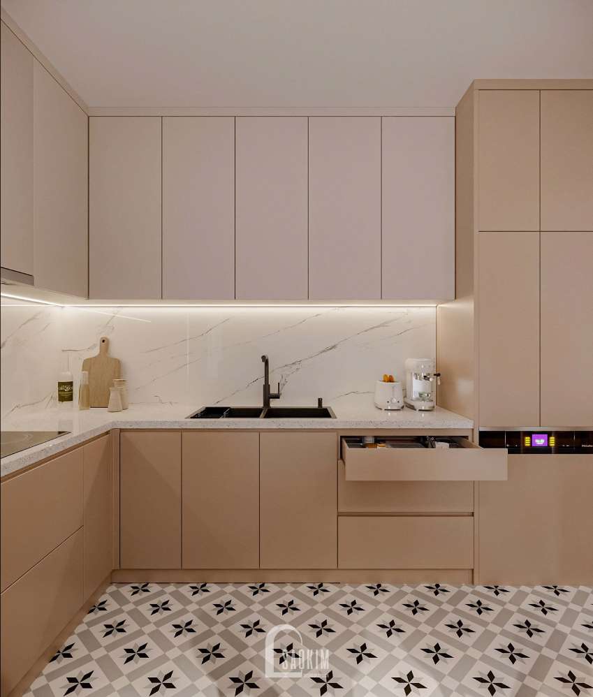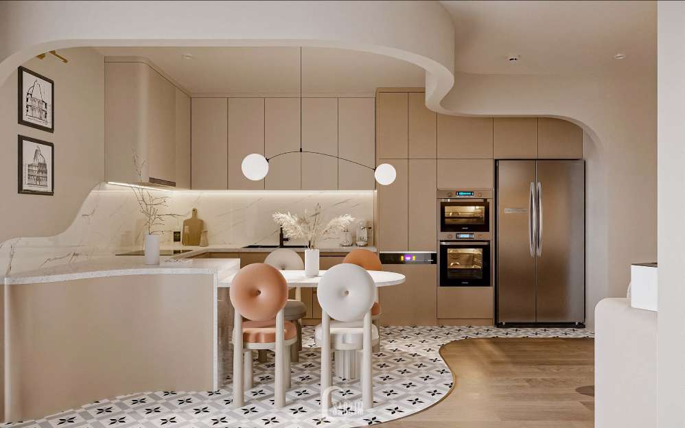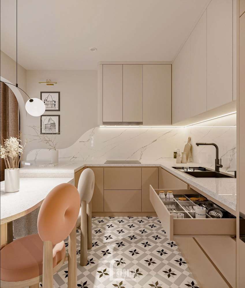 Thiết kế nội thất phòng bếp với các đường nét tự nhiên thể hiện trong phong cách Wabi Sabi mix Scandinavian