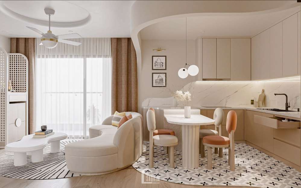 Thiết kế chung cư phong cách Wabi Sabi mix Scandinavian sử dụng màu sắc trung tính, như trắng, xám cho bức tường và trần, thêm một chút màu sắc tự nhiên bằng cách sử dụng các phụ kiện và trang trí 1 số chi tiết như nâu đậm tạo ra một không gian ấm áp, tối giản, và tôn trọng vẻ đẹp tự nhiên.