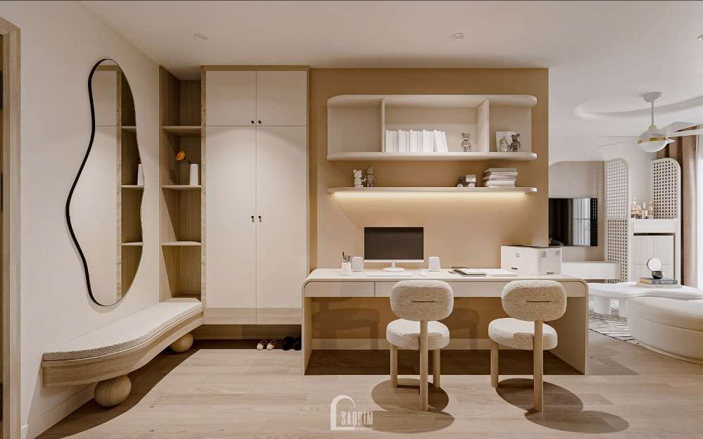 Bên cạnh thiết kế nội thất phòng bếp liền kề phòng khách, KTS còn thiết kế thêm một không gian làm việc tại đây giúp cho gia chủ có cảm giác thoải mái, không bị ngột ngạt.