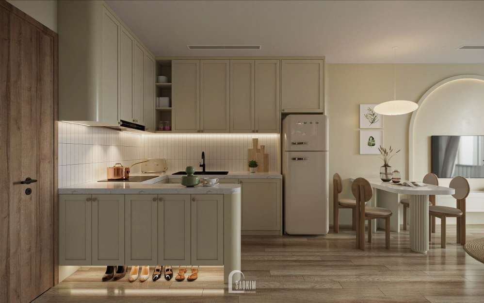 Phòng bếp được lưu thông với phòng khách giúp không gian trở nên tiện lợi