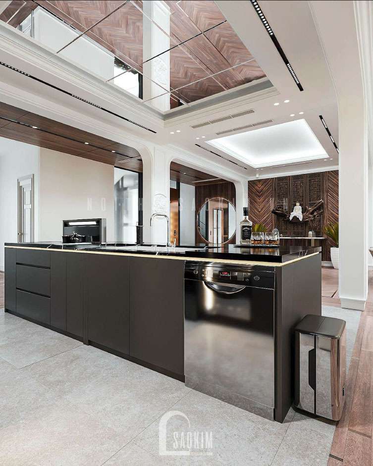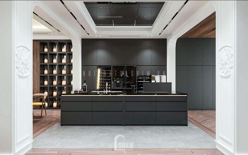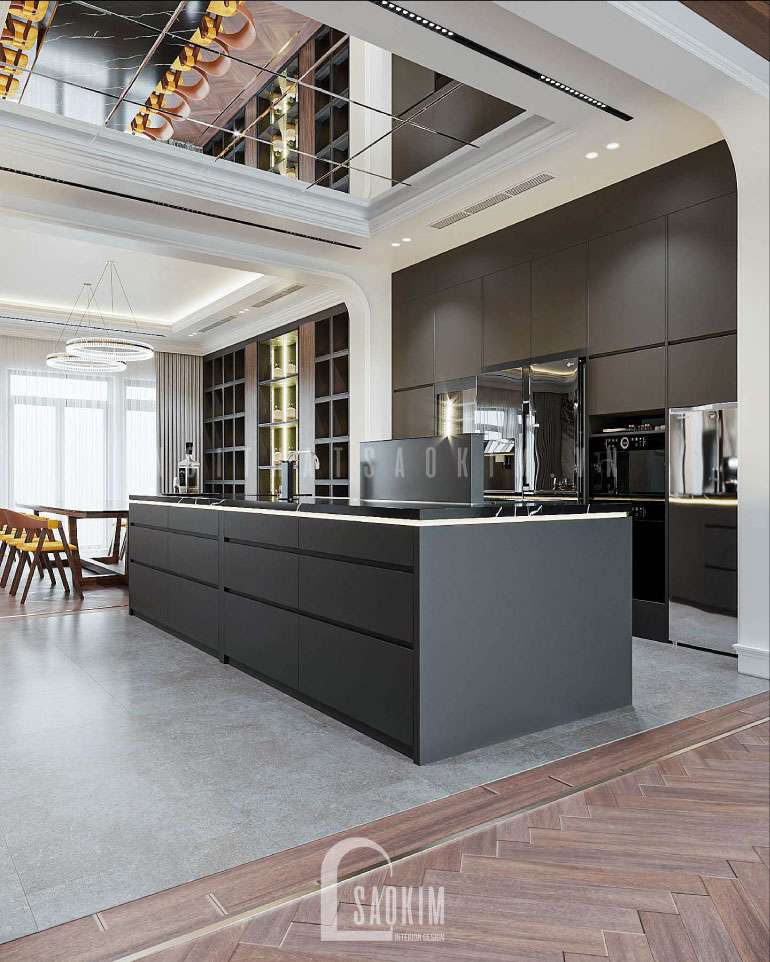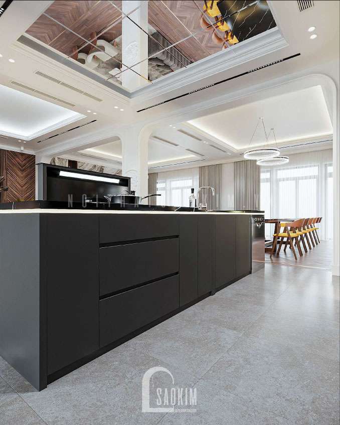 Trần thiết kế nội thất phòng bếp nhà liền kề ốp gương giúp tạo độ sâu và cảm giác sang trọng hơn. Thiết bị bếp cao cấp như hút mùi âm bàn, máy rửa bát, bếp từ, lò nướng, thùng rác thông minh được trang bị đầy đủ.