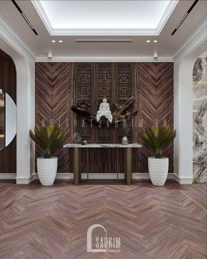 Thiết kế phòng thờ đơn giản, không quá cầu kì. Việc thiết kế phòng thờ cùng không gian với phòng khách tiện cho việc cúng lễ thể hiện sự tôn kính và trang nghiêm.