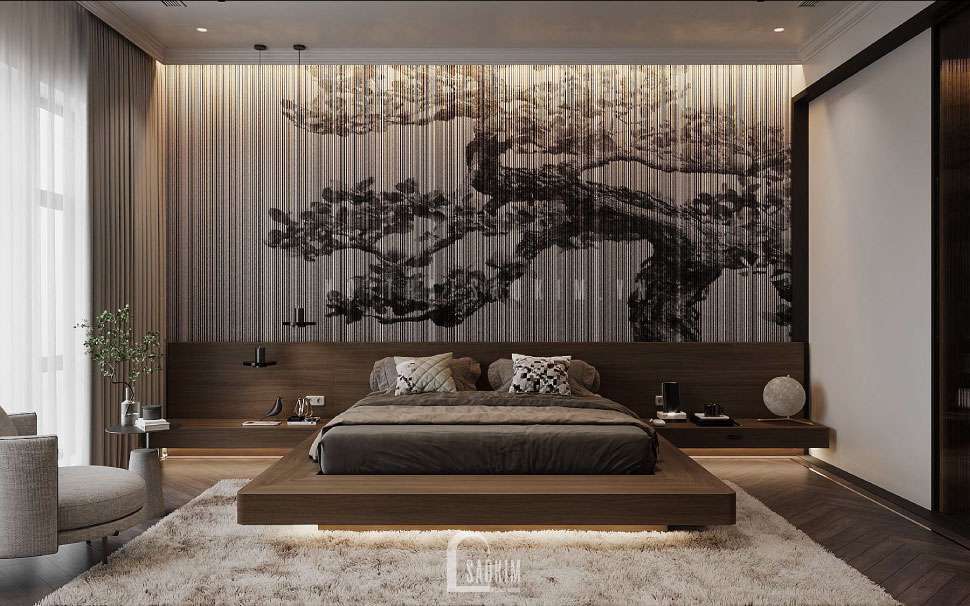 Thiết kế nội thất phòng ngủ tại thiết kế nhà liền kề hiện đại của KTS Nội Thất Sao Kim với giường ngủ êm ái giúp có được giấc ngủ sâu hơn.Vách đầu giường phòng ngủ ốp gỗ và trang trí bức tranh tường độc lạ.